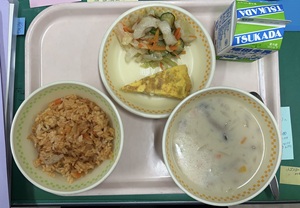 ちなみに、次の写真はこれまたおいしい、五泉小学校の昨日の献立です。いつも、調理員さんが心を込めて作ってくださいます。18日のメニューは、チキンライス、アンサンブルエッグ、ちくわサラダ、とうにゅうスープ、牛乳でした。きゅうり、キャベツ、ニンジン、トウモロコシとちくわを、塩、ごま油、砂糖を使って和えたサラダは、ちくわがアクセントになってとってもおいしかったです。ぜひ、ご家庭でも作ってみてください!