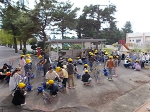 たねを植えて一生懸命に育ててきたあさがおのつるを使って、リースづくりをしました。リースにする前の午前中に、最後のたね採りも行い、たくさんのたねを集めていたようです。ある子は「このたねを来年の1年生にプレゼントするんだ!」と教えてくれました。ずっと育ててきてたくさんのきれいな花を咲かせてくれたあさがおさんとお別れするのはちょっと寂しい気持ちになりますが、リースとして新しい形にリメイクされていきます。支柱からあさがおのつるを外したり、外したつるをまとめてリースにしたりすることは大変な作業でしたが、たくさんの保護者、地域のボランティアの方々のおかげで、時間内に全ての子供たちのリースが完成し、あさがおの鉢が片付きました。作業の後で、草を取ってくださっている方もいらっしゃいました。保護者の皆様、地域の皆様に心より感謝申し上げます。これからも五泉小学校の子どもたちにたくさんのお力をお貸しください。