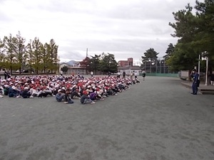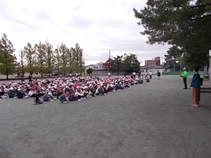 火災を想定した避難訓練を行いました。今回は、家庭科室で火災が生じた想定です。非常ベルの音で動きを止めて静かにし、放送を聞く。ハンカチを口に当てて、放送の「避難開始」の指示を聞いてグラウンドに避難します。五泉小学校の子供たちは、全校424人いますが、全校朝会等で全員が集まった際に口を閉じで待つことができるすごい子供たちです。今回の避難訓練でも真剣に訓練に参加し、グラウンドに集まった際もしっかりと口を閉じることができていました。