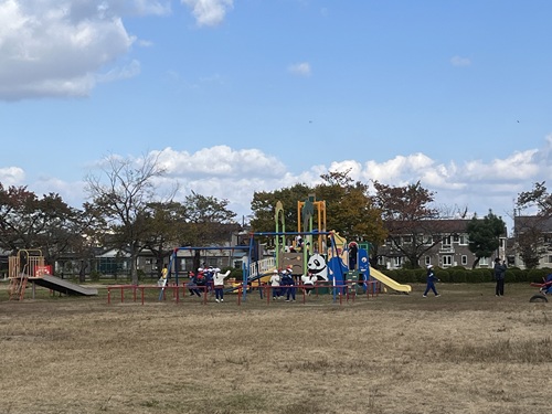 1年生 秋さがし 1年生が秋探しに行ってきました。今年は市内の各地でクマの目撃情報がたくさんあることから、村松公園・愛宕山ではなく、バスに乗って南公園に行ってきました。小高い丘に見晴らし台があったり、たくさんの遊具や広いグラウンドが会ったりして、大きくてとっても居心地のいい公園でした。落ち葉やどんぐり拾いを行い、遊具でたくさん遊んで帰ってきました。天候にも恵まれて、最高の遠足日和でした。